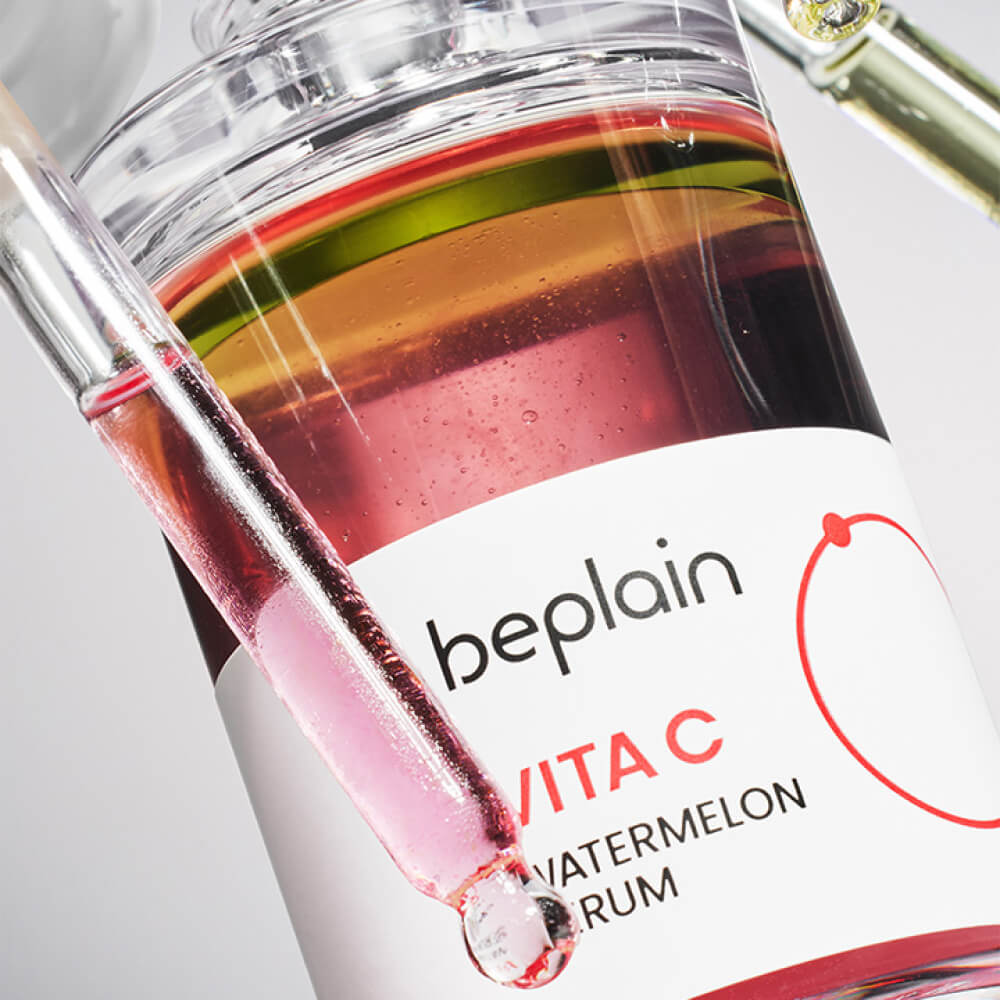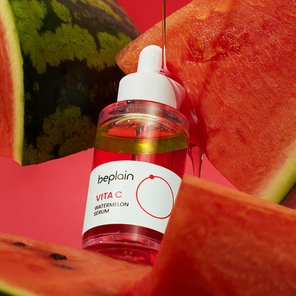 Сыворотка для сияния кожи с экстрактом арбуза Beplain Vita C Watermelon Serum мягко осветляет и выравнивает оттенок кожи, устраняя тусклость. Она подавляет активность меланоцитов, помогая уменьшить пигментацию и следы от постакне. Также тонизирует, снимает отёки, увлажняет и замедляет процессы старения. В составе сыворотки – ниацинамид, витамин С, глутатион и кофеин.