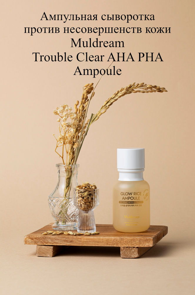 Muldream Glow Rice Ampoule работает одновременно по нескольким направлениям — увлажнение и гидратация, устранение морщин и улучшение тонуса кожи, а также деликатная эксфолиация, которая стимулирует клеточное обновление эпидермиса.
